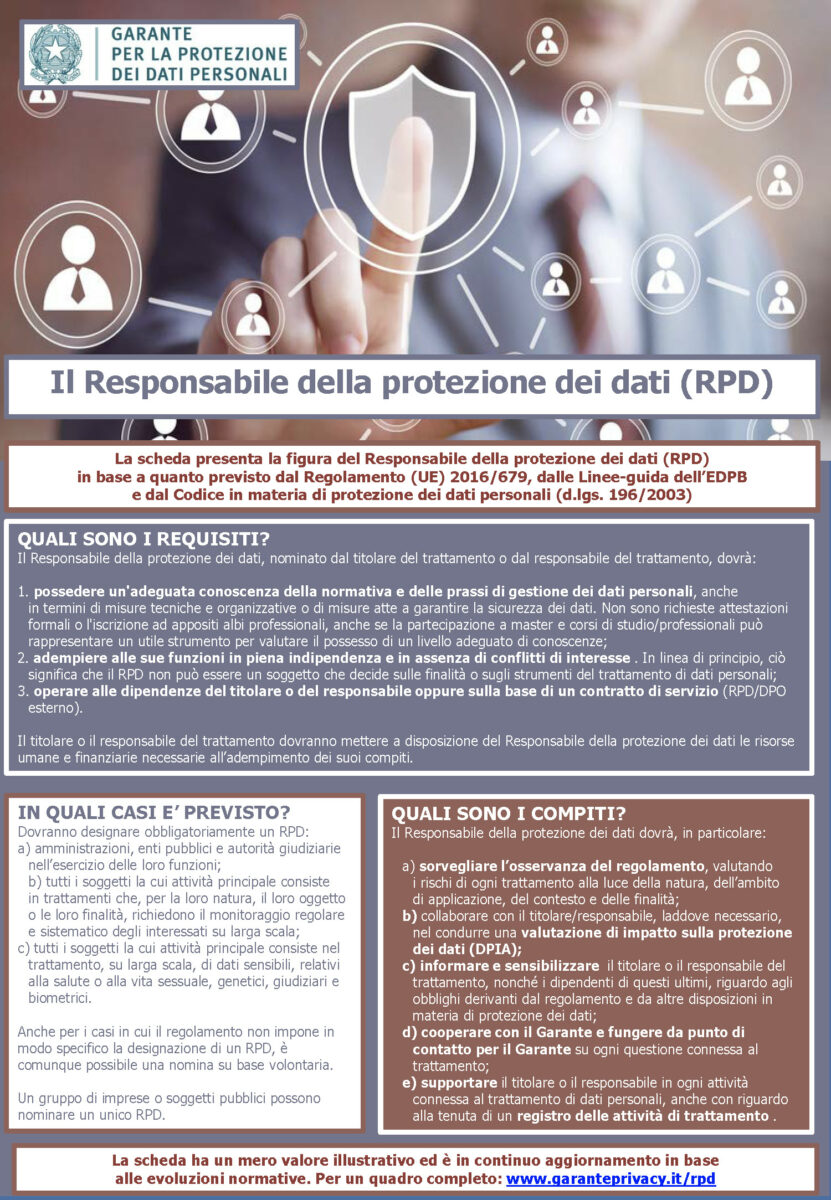 ATTENZIONE: Tale procedura è l’unica che può essere utilizzabile per l’invio, la variazione e la revoca dei dati di contatto del Responsabile della protezione dei dati e non potranno essere prese in considerazione le comunicazioni effettuate attraverso diversi canali di contatto con il Garante (es. e-mail, posta, ecc.). Attraverso la procedura indicata non è consentito presentare quesiti, richieste e istanze al Garante, in quanto predisposta unicamente per la ricezione delle informazioni relative al Responsabile per la protezione dei dati. Per le altre istanze, si prega di utilizzare i moduli specificatamente messi a disposizione sul sito.